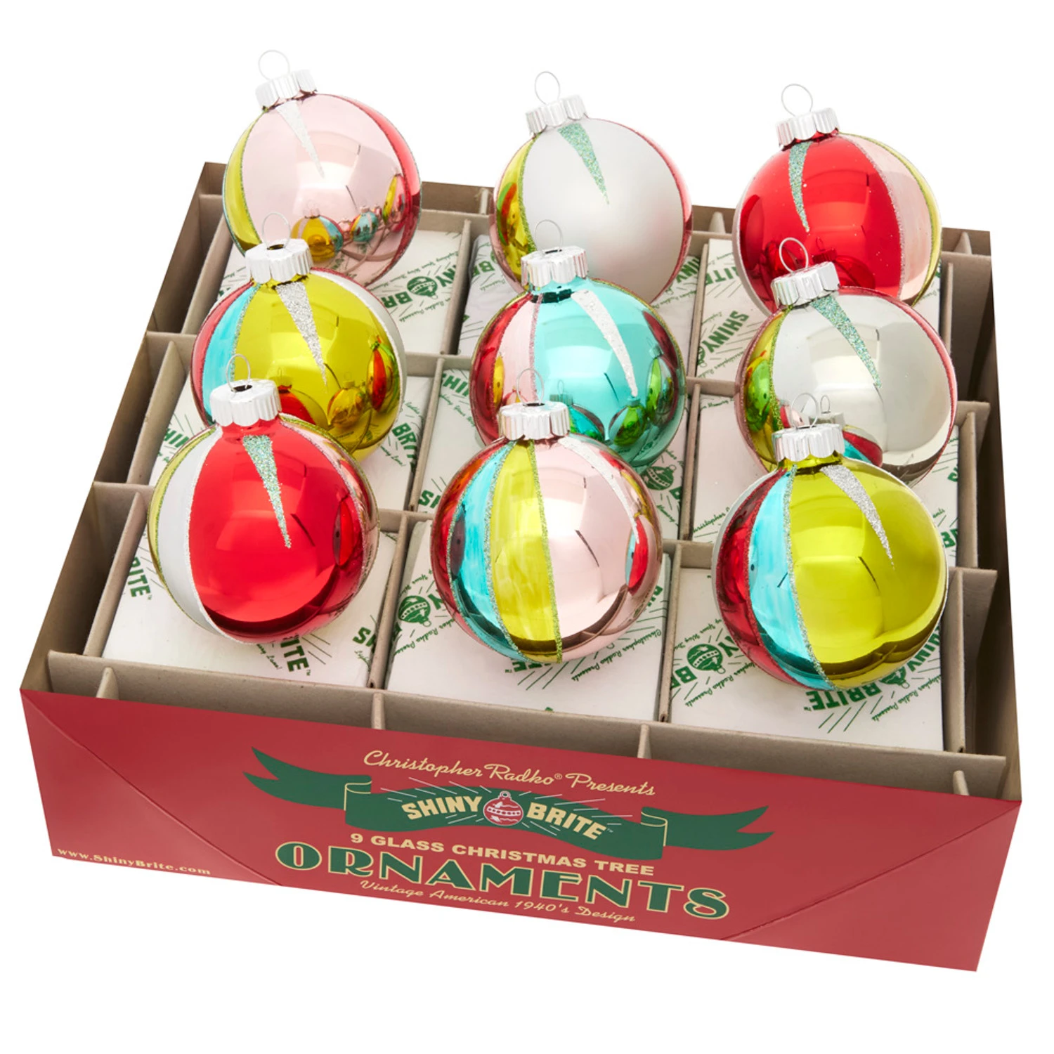 This gorgeous set of vintage inspired ornaments feature stunning colors of lime green, silver, blue, red, and light pink block stripes and accents of sparkly glitter! Sure to give a fun pop-art look to your tree! Sold as a set of 9 ornaments. Made by Christopher Radko for Shiny Brite. Made of glass. Dimensions: each ornament is 2.5″. Item #: 4028174