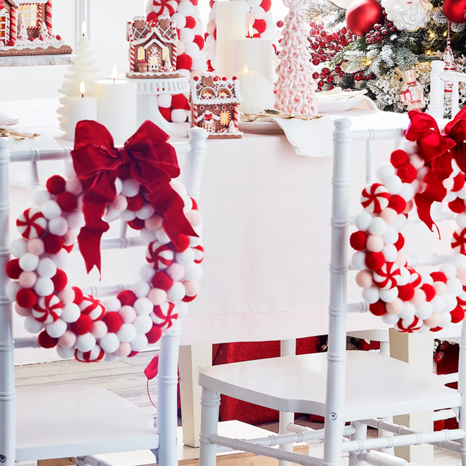 Have you ever seen a cuter wreath?? It features light pink, bold red, and bright white pom pom balls dotted with red and white peppermint candies in the shape of a wreath finished off with a red velvet bow! Made by Raz Imports. Made of polyester, wool, and felt. Dimensions: 13″. Item #: W4316146Â