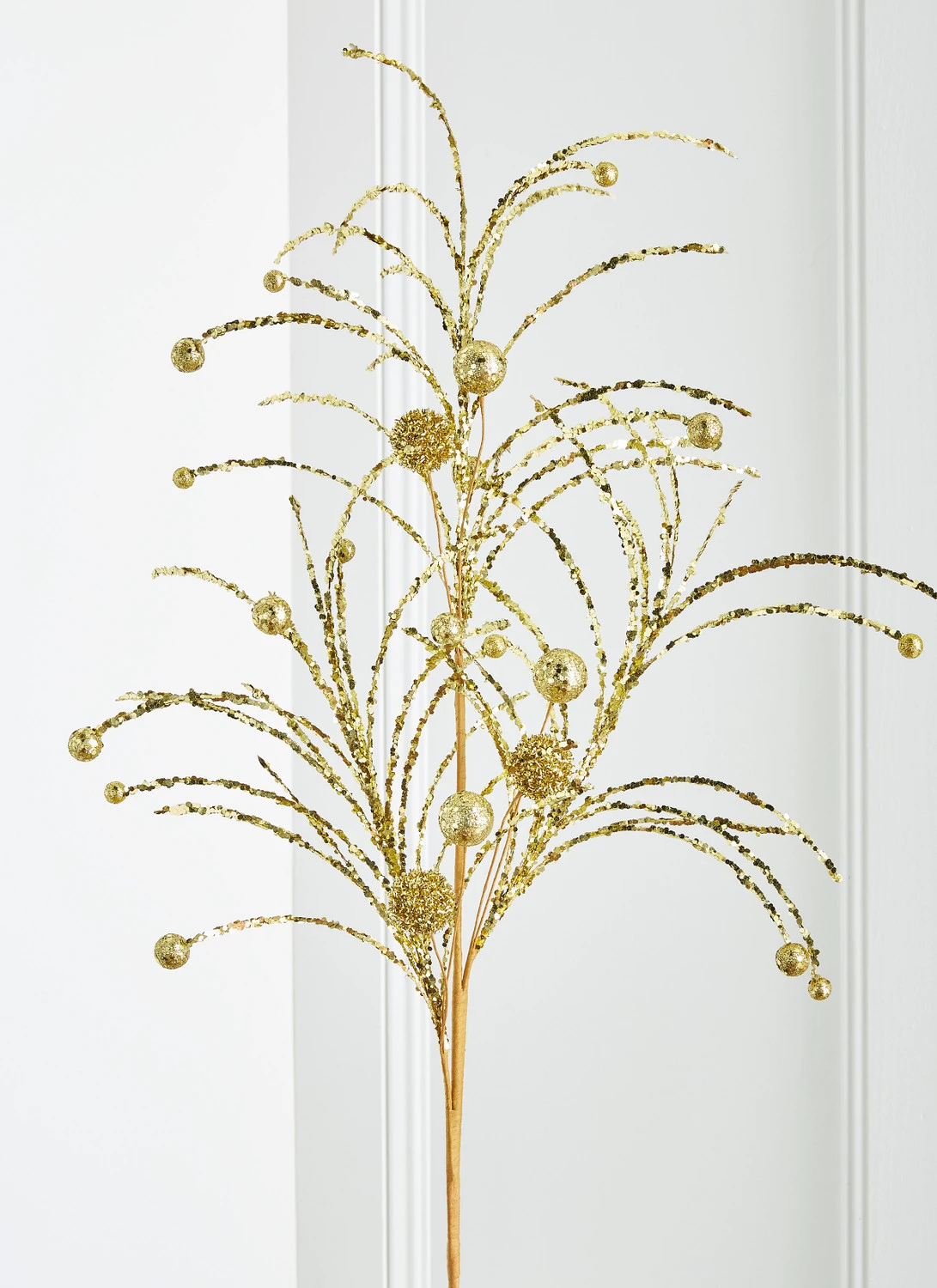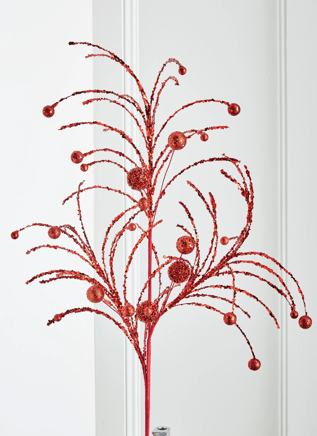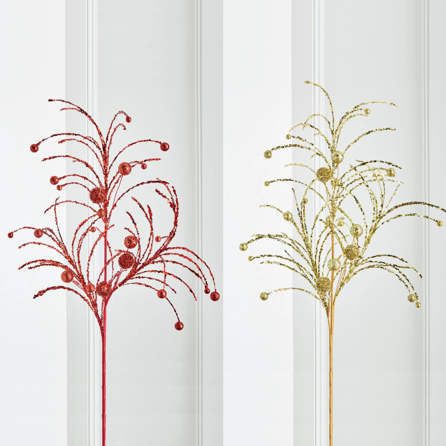You can never have too much glitter during the holidays! Choose between a red of gold glitter spray that looks like a fireworks with flowing branches and ball ornaments covered in sparkling glitter! Each sold individually. Made by Raz Imports. Made of plastic and foam. Dimensions: 42″. Item #: F4302501 or F4302503