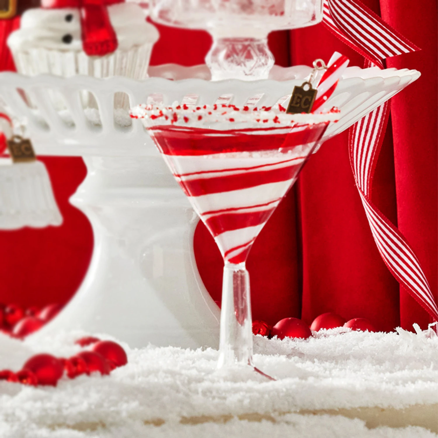 Time to celebrate Christmas style! Holiday themed drinks are the perfect way to get into the Christmas spirit! This features a martini glass with red swirled stripes filled with white liquid and rimmed with crushed peppermint! Made by Raz Imports. Made of glass. Dimensions: 4″ L X 3.5″ W X 6″ H. Item #: 4353119Â